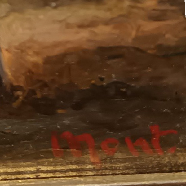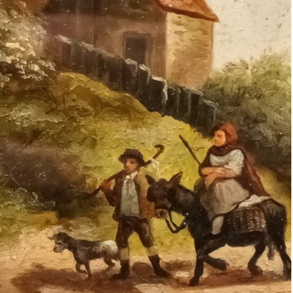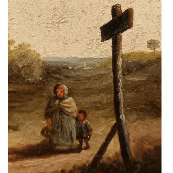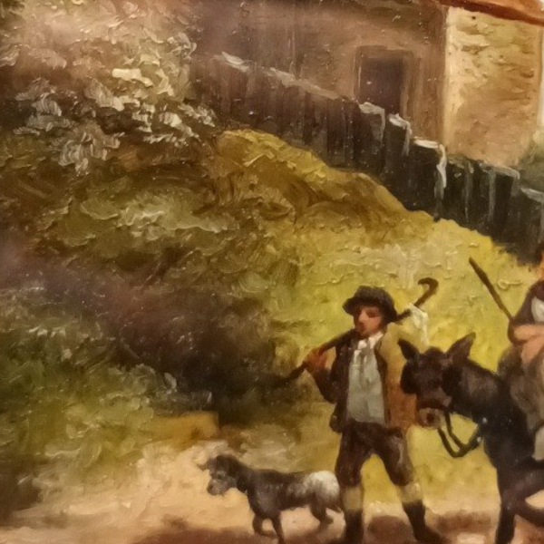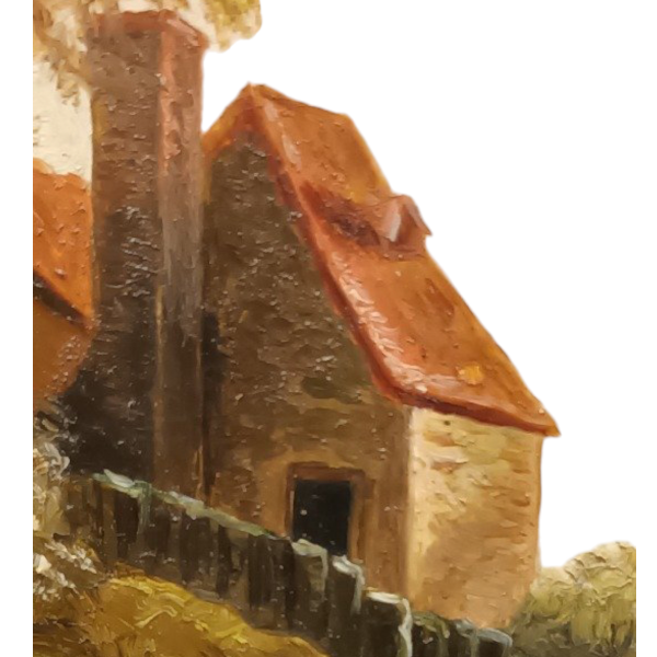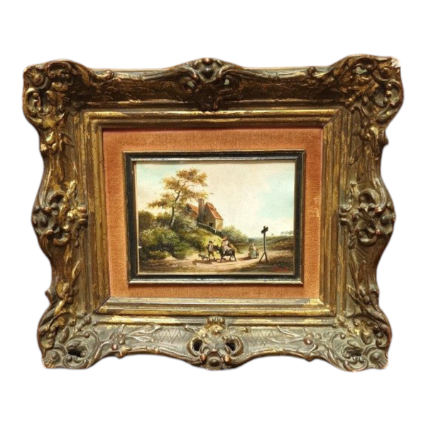 Montaner Miguel, óleo sobre Cartón, casa con personajes 15cm x 12cm