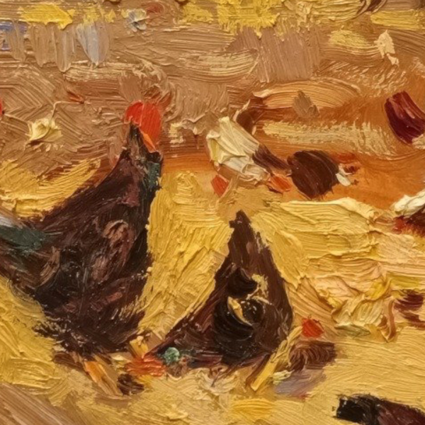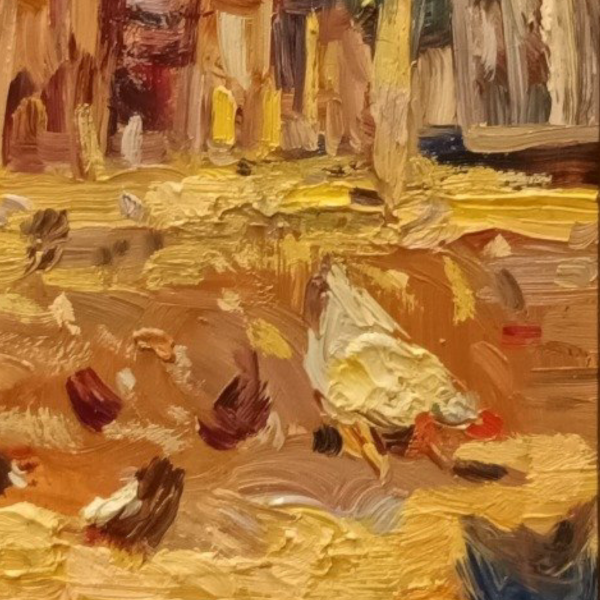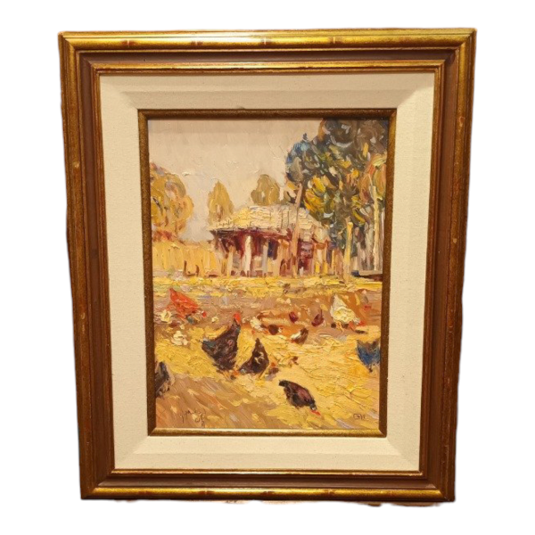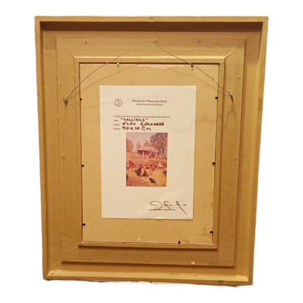 Montoya Ortiz Heriberto, óleo sobre madera "Gallinas" 40cm x 30cm