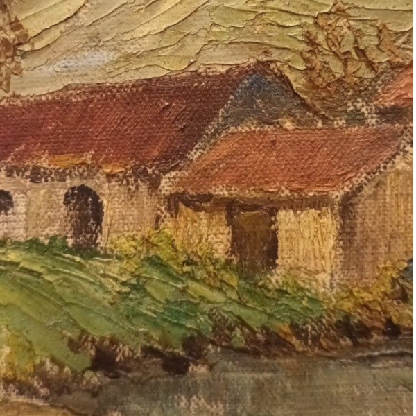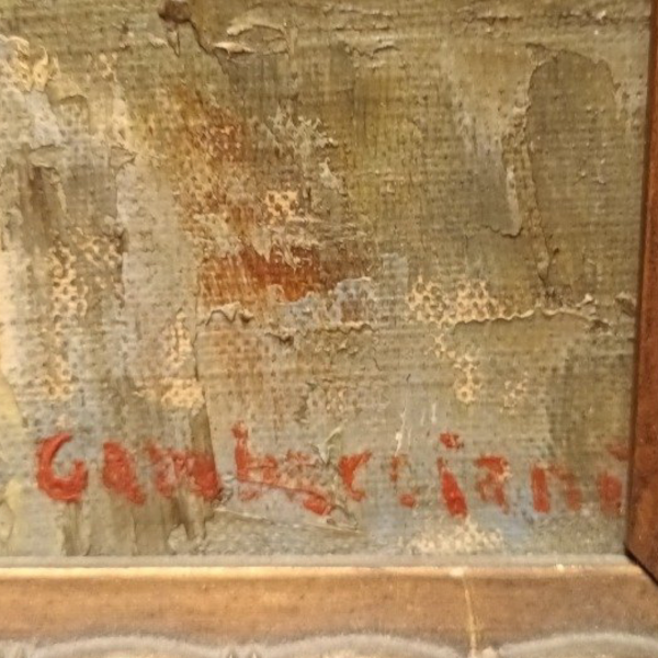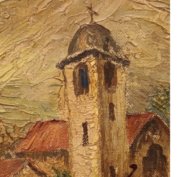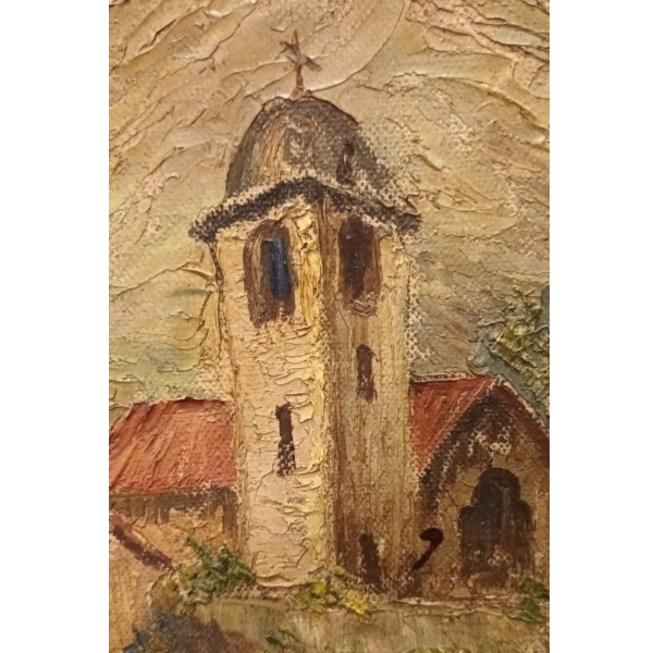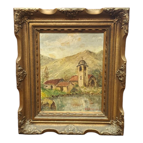 Oleo sobre carton firma Ilegible Capilla 22cm x 30cm